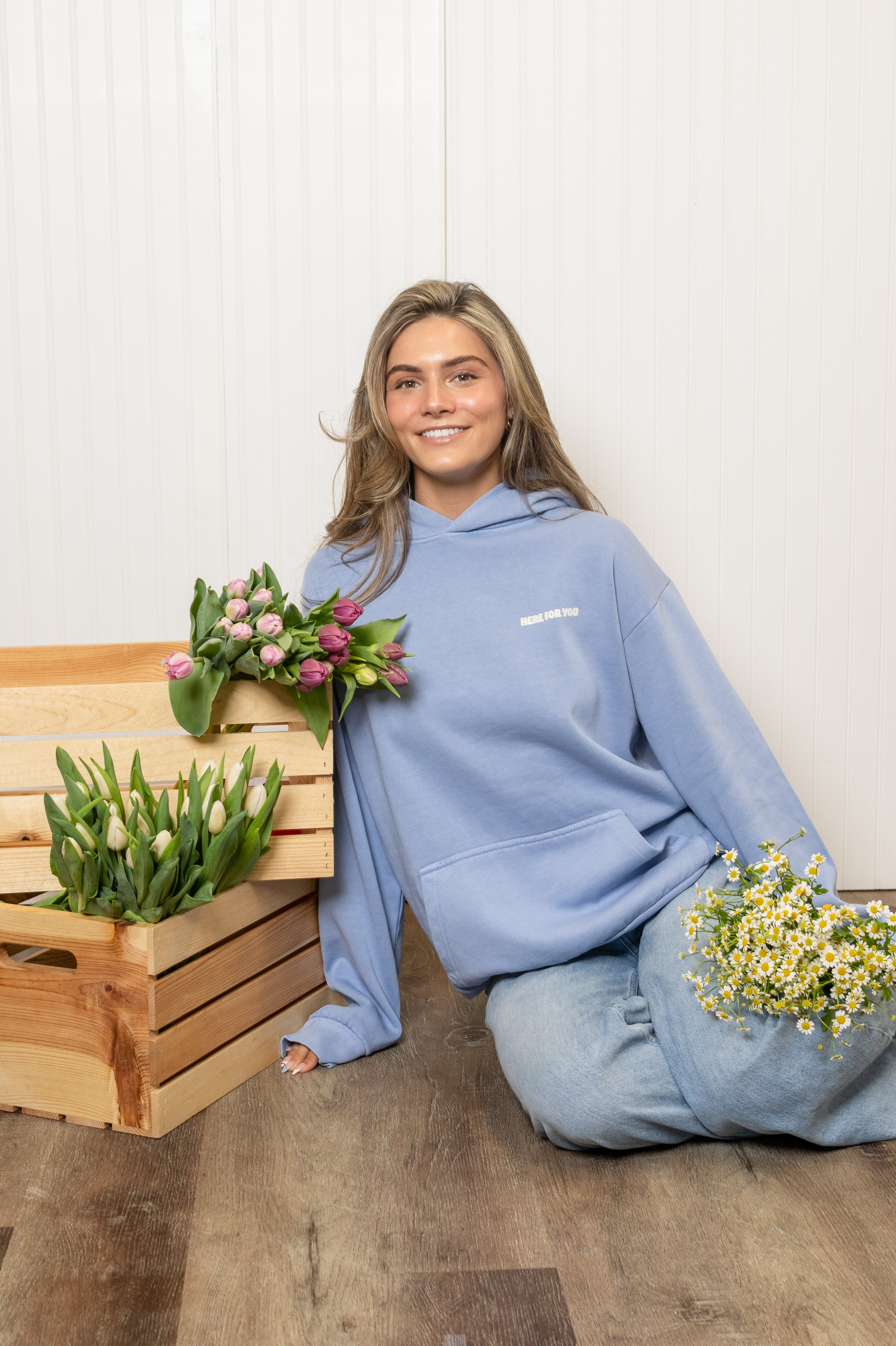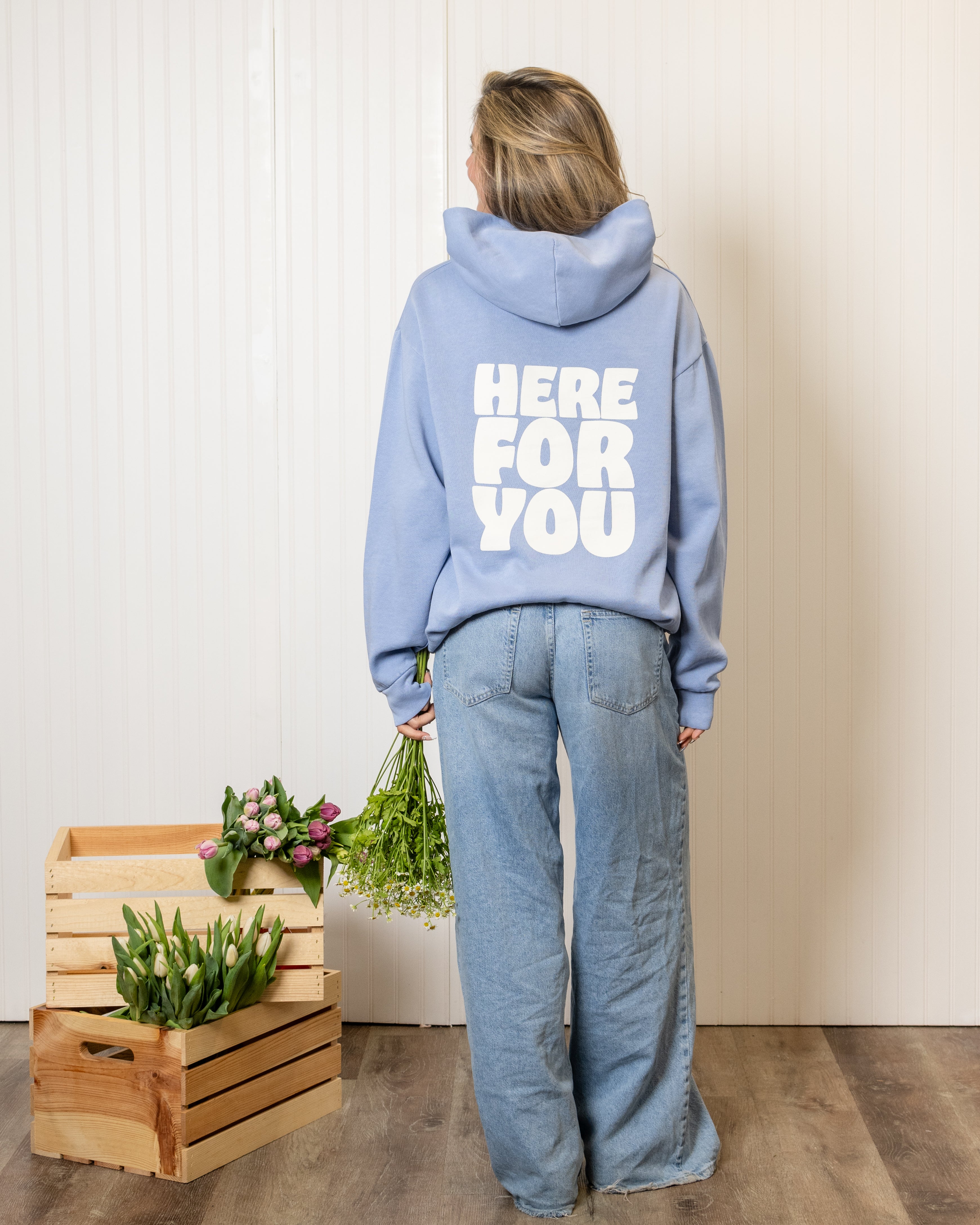 Your new favorite hoodie has arrived. Designed for ultimate comfort, the Here For You Hoodie keeps it simple yet meaningful. With a roomy, no-strings fit, ultra-soft tightly spun cotton, and a spacious kangaroo pocket, it’s perfect for all-day wear. For the best fit, stick to your true size for a relaxed feel or size up for an oversized look!